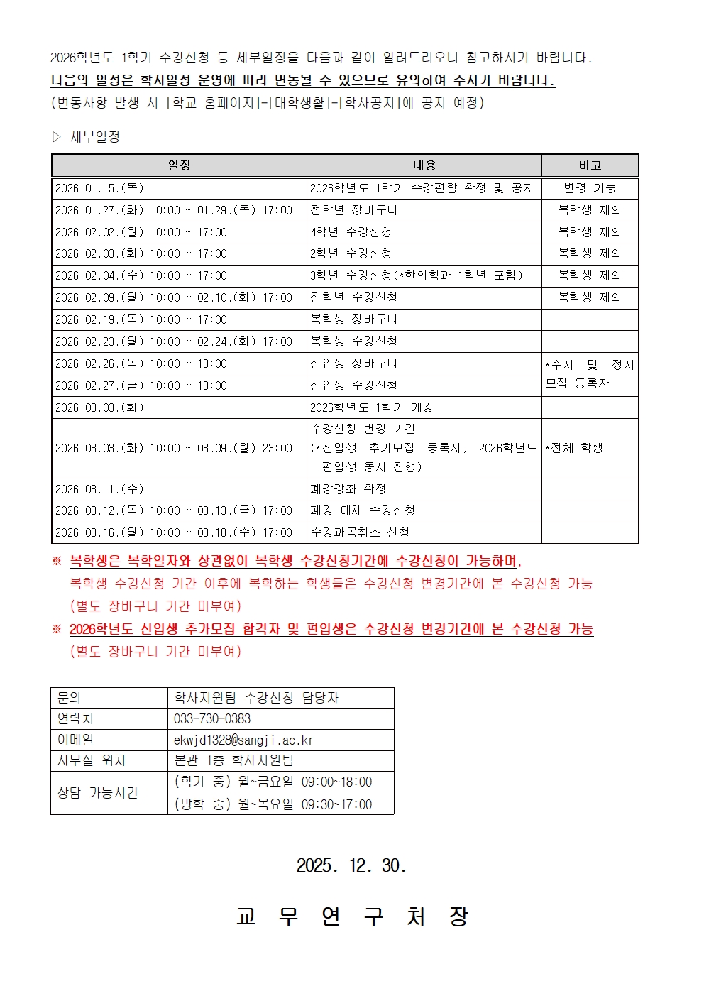 2026학년도 1학기 수강신청 등 세부일정 확정 알림